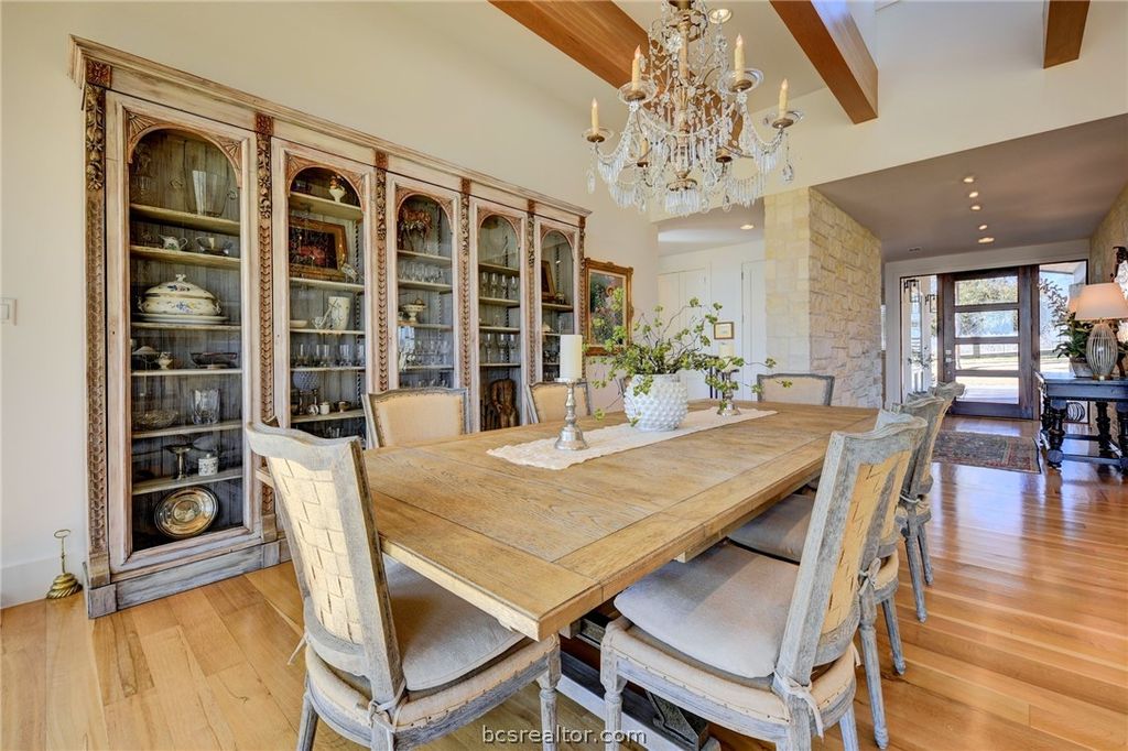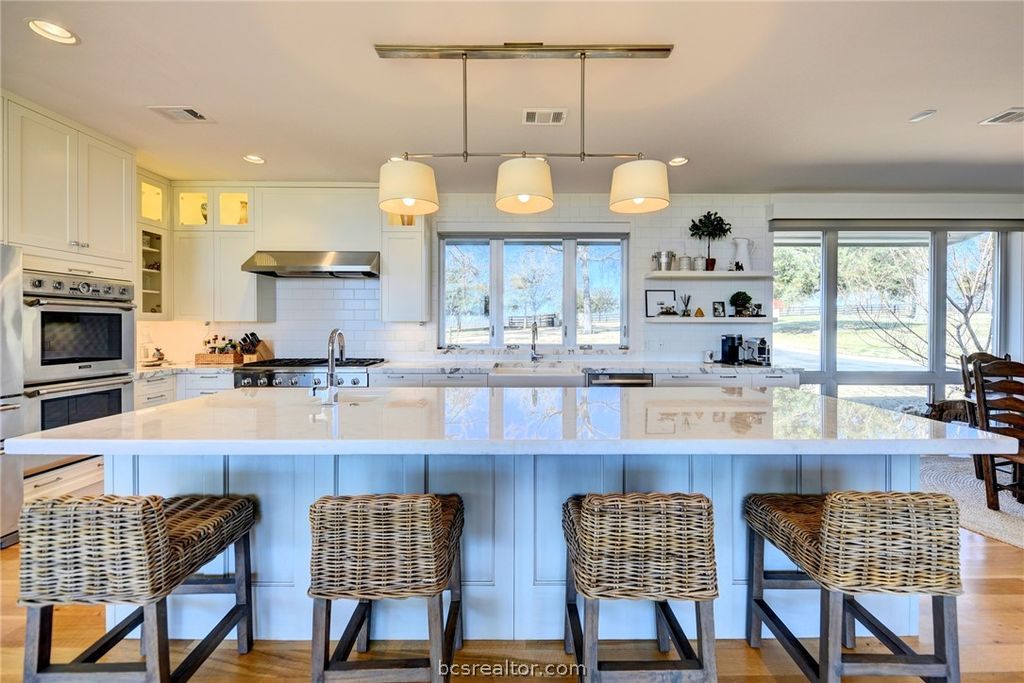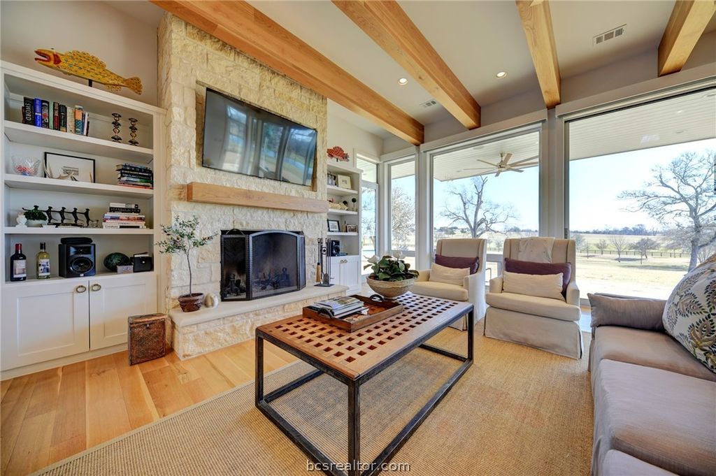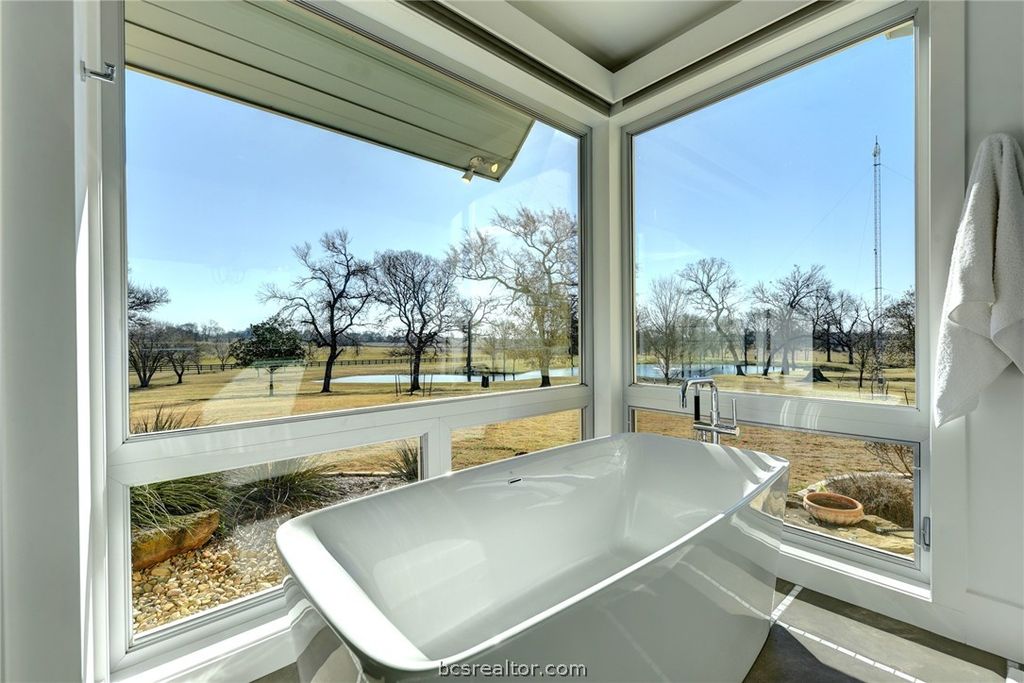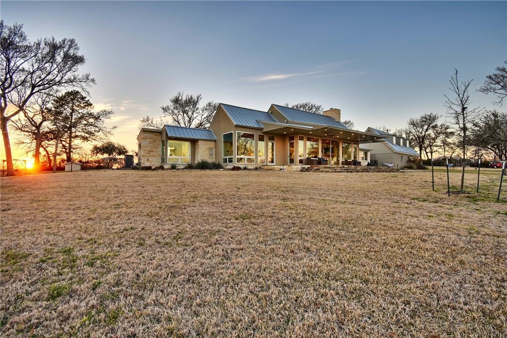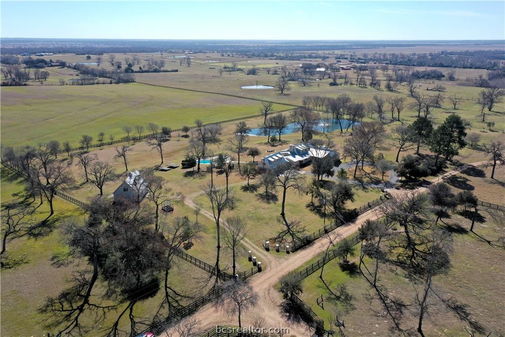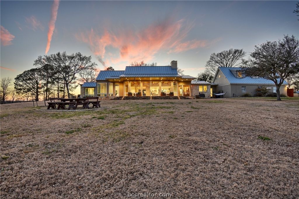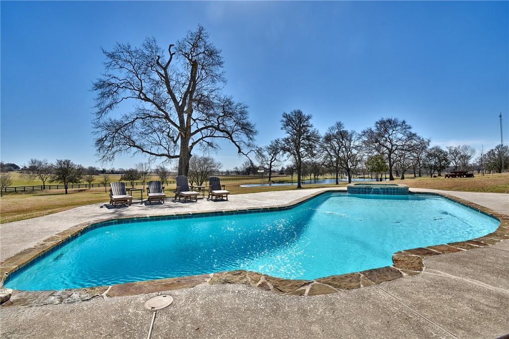 Tucked away just north of Chappell Hill on one of Washington County's most scenic lanes, this striking 2016 contemporary estate delivers a rare blend of refined design, thoughtful craftsmanship, and wide-open Hill Country views. Designed by BBA Architects and built by Keith Ellis Custom Homes, the approx. 3,660 SF residence is centered around a true central great room with soaring ceilings, skylights, a fireplace, and sliding walls of glass that seamlessly open to expansive flagstone porches overlooking the resort-style pool and a picturesque pond with fountain. The one-story layout with bonus space above the oversized three-car garage is designed for effortless entertaining, featuring a marble island kitchen with high-end appliances, a walk-in pantry with wine cooler, and light-filled living spaces that capture uninterrupted views in every direction. Set on 11 rolling acres with scattered live oaks, multiple water wells, a barn with full bath, and surrounding large ranch properties, this is a private, beautifully improved retreat where indoor-outdoor living truly takes center stage. Properties of this caliber, with this level of privacy and views, are truly one of a kind.